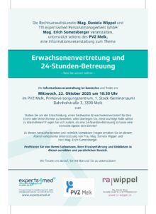 Die Rechtsanwaltskanzlei Mag. Daniela Wippel und TTI experts4med Personalmanagement GmbH Mag. Erich Sumetsberger veranstalten, unterstützt seitens des PVZ Melk, eine kostenlose Informationsveranstaltung zum Thema Erwachsenenvertretung