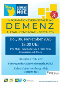 Das PVZ Melk und das NÖ Demenzservice laden Sie zum 3.Teil der Vortragsreihe Demenz: Alltag-Gemeinsam-Gestalten“ ein. Wann? 06.11.2025 um 18 Uhr Einlass? Ab 17:30 Uhr